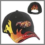 The cap bill features a flame design with Mustang logo. Cotton twill cap with an adjustable back strap closure. Flaming pony in front.